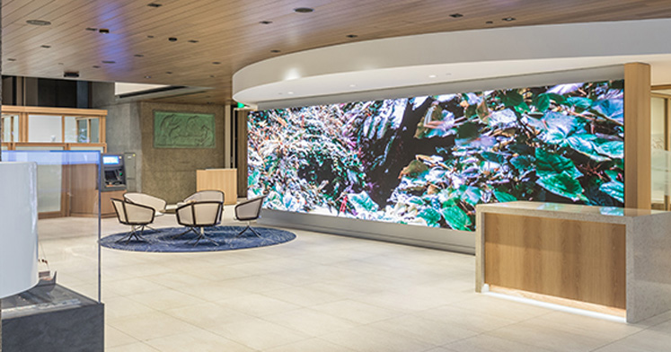 AV crea absolutamente una atmósfera en el Bank of Hawaii, donde Ford Audio-Video instaló una pared LED de 33 pies en el vestíbulo. “Esta es una sección del banco con mucho tráfico en la que normalmente se ven ilustraciones estáticas y mensajes promocionales, lo que establece un tono monótono para los clientes que frecuentan el banco”, dice Routman. “Al utilizar una pared de video LED que abarca toda la superficie, pueden producir una experiencia única para el cliente cada vez que lo visita. Este cambio de escenario puede producir un efecto psicológico en las personas. Aporta una sensación de emoción, que hace que las tareas mundanas, como depositar cheques, sean más agradables ".